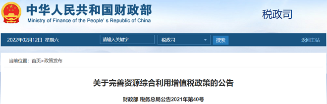 為推動資源綜合利用行業持續健康發展,財政部、國家稅務總局印發《關於完善資源綜合利用增值稅政策的公告》(財政部 稅務總局公告2021年第40號)(以下簡稱“《公告》”),明確自2022年3月1日起執行新的資源綜合利用增值稅政策。