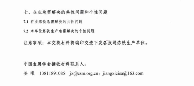 2. 2021年各企業煉鐵生產技術總結交換材料Word版本。各單位需提供本企業交換材料,會議期間交流下發各生產單位。接收材料聯係人:薑曦 13811891085;;