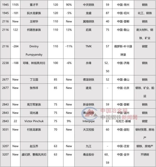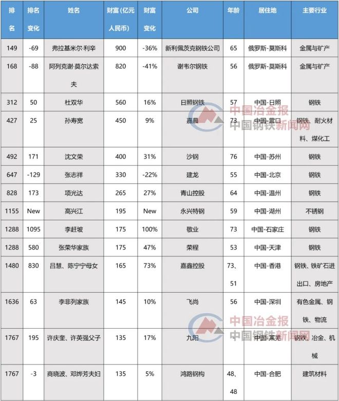 國內鋼鐵行業,杜雙華(560億)、方威(465億)、孫壽寬(450億)、沈文榮、張誌祥、項光達、高興江、李趕坡、張榮華、董才平、王樹華、劉鋒、丁立國等多位企業家上榜。