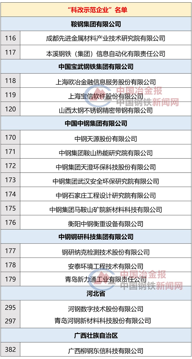 從《名單》中獲悉,此次入選“科改示範企業”名單共有440家,其中鞍鋼集團、中國寶武鋼鐵集團、中國中鋼集團、中國鋼研科技集團、河鋼集團、柳鋼集團等18家鋼鐵企業(含下屬企業)上榜。