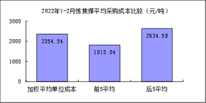 1-2月對標企業煉焦煤平均采購成本最低的前5家企業折算成幹基的加權平均采購成本為1813.04元/噸,比對標企業平均采購成本低541.50元/噸,低於平均采購成本23.00%;而采購成本最高的5家企業的加權平均采購成本為2634.59元/噸,比對標企業平均采購成本高280.05元/噸,高於平均采購成本11.89%。