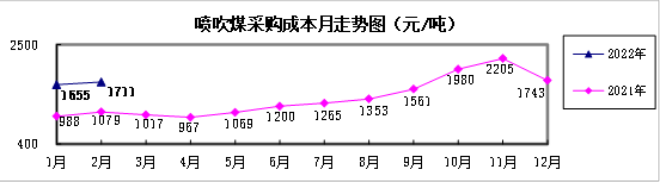 噴吹煤2月份加權平均折算成幹基的采購成本為1710.63元/噸,環比升高55.67元/噸,升幅為3.36%。1-2月累計平均折算成幹基的采購成本為1679.18元/噸,同比升高645.68元/噸,升幅為62.47%。