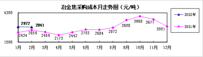 冶金焦2月份加權平均折算成幹基的采購成本2941.41元/噸,環比下降30.25元/噸,降幅為1.02%。1-2月累計平均折算成幹基的采購成本為2961.37元/噸,同比升高417.10元/噸,升幅為16.39%。