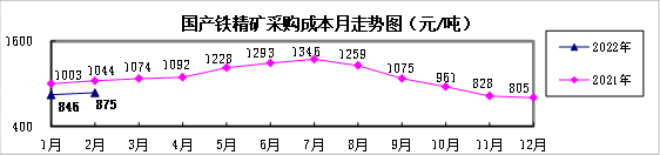國產鐵精礦(幹基)2月份加權平均采購成本為874.76元/噸,環比升高28.80元/噸,升幅為3.40%。1-2月累計平均采購成本為859.67元/噸,同比下降161.74元/噸,降幅為15.83%。