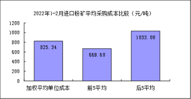 1-2月對標企業進口粉礦折算成62%品位的平均采購成本為825.34元/噸,成本最低的前5家企業的加權平均采購成本為669.60元/噸,比對標企業平均采購成本低155.74元/噸,低於平均采購成本18.87%;而采購成本最高的5家企業加權平均采購成本為1033.00元/噸,比對標企業平均采購成本高207.66元/噸,高於平均采購成本25.16%。