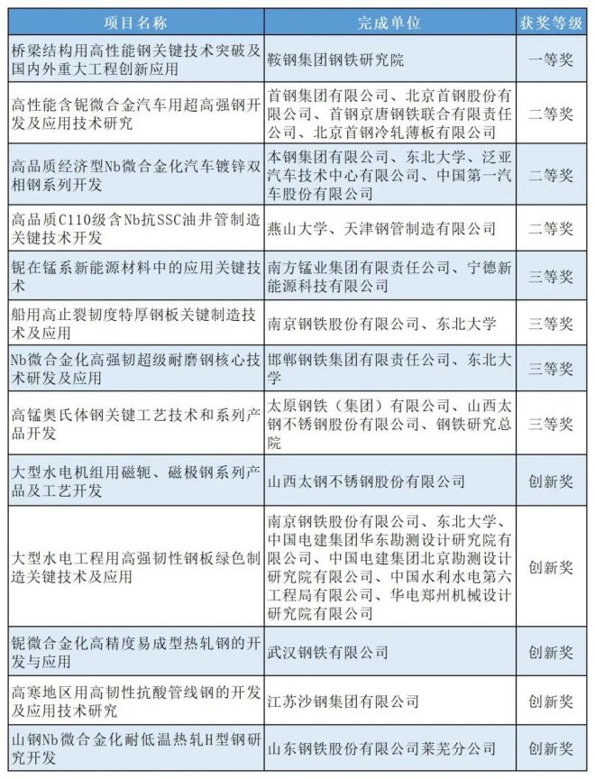2008年,該獎項在國家科學技術獎勵工作辦公室登記備案,屬於社會力量設立科學技術獎勵,每兩年評定一次。截至2021年末,中信铌鋼技術進步獎評審工作已開展15次,共有99個項目獲得這一獎項,對推動我國含铌鋼開發及應用技術的發展起到了積極的作用,獲得了鋼鐵行業、科研院所以及下遊應用領域的廣泛認可。