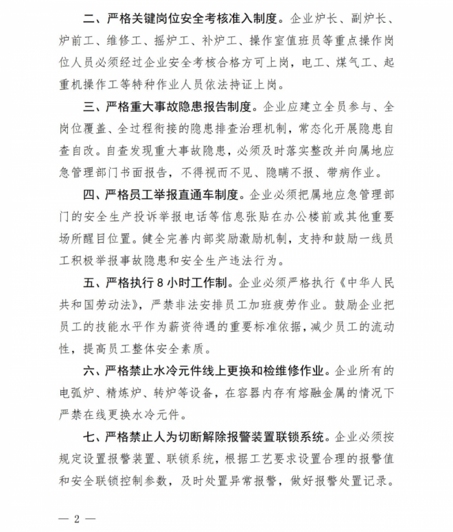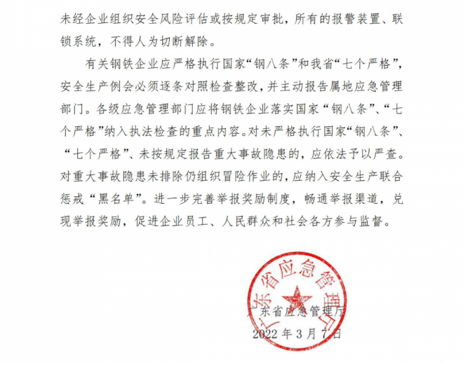 近日,廣東省應急管理廳下發了關於堅決落實鋼鐵企業安全管理“七個嚴格”的de通tong知zhi。通tong知zhi提ti到dao,為wei切qie實shi落luo實shi鋼gang鐵tie企qi業ye安an全quan生sheng產chan主zhu體ti責ze任ren,有you效xiao防fang範fan化hua解jie安an全quan風feng險xian,嚴yan防fang爆bao炸zha等deng各ge類lei事shi故gu發fa生sheng,現xian提ti出chu加jia強qiang廣guang東dong省sheng鋼gang鐵tie企qi業ye安an全quan管guan理li“七個嚴格”措施(以下簡稱“七個嚴格”),在嚴格落實安全生產專項整治三年行動“鋼八條”(以下簡稱國家“鋼八條”)基礎上,一並貫徹執行。