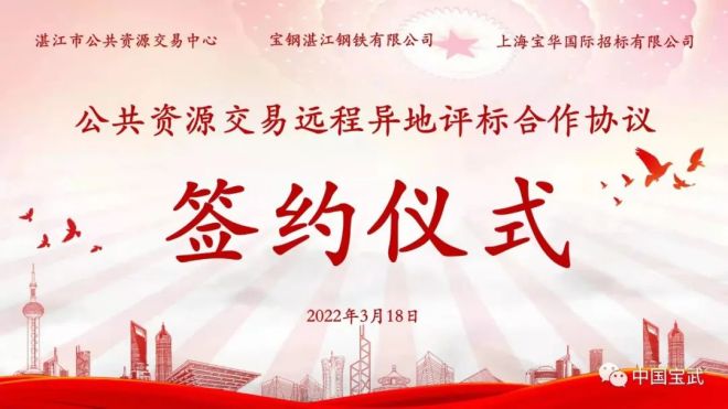 3月18日下午,寶鋼工程寶華招標攜手湛江市公共資源交易中心、寶鋼股份湛江鋼鐵,以視頻雲方式簽訂“湛江進場交易的項目試行上海、湛江兩地遠程評標”三方協議,這標誌著湛江市公共資源交易項目遠程異地評標工作正式啟動。