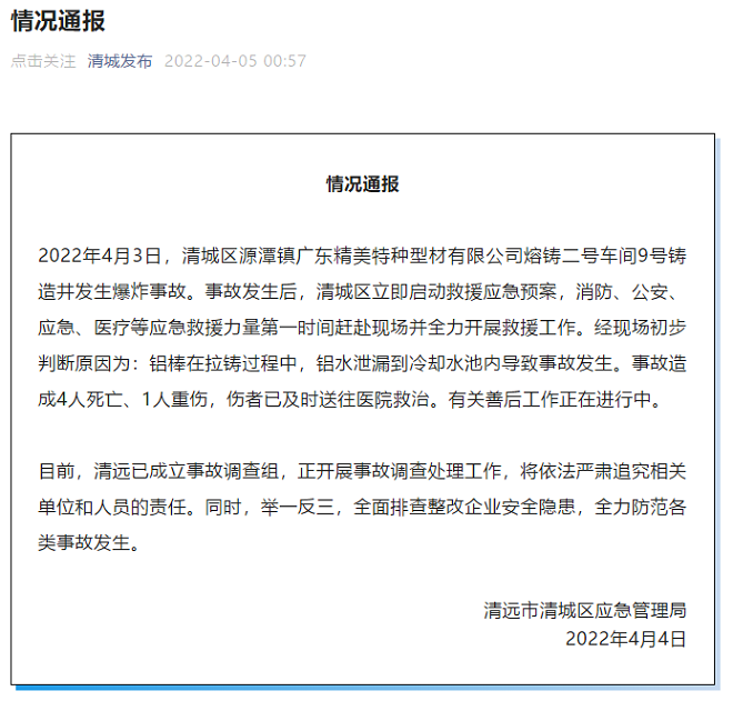 4月5日,清城發布公眾號發布了《情況通報》。從通報中獲悉,2022年4月3日,廣東省清遠市清城區源潭鎮廣東精美特種型材有限公司熔鑄二號車間9號鑄造井發生爆炸事故。經現場初步判斷原因為:鋁棒在拉鑄過程中,鋁水泄漏到冷卻水池內導致事故發生。事故造成4人死亡、1人重傷,傷者已及時送往醫院救治。