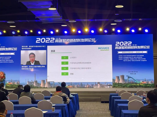 另外,北京首鋼股份有限公司專家胡誌遠、蘇州彙川技術有限公司電機研發總監褚文強、浙商證券首席分析師馬金龍分別就首鋼電工鋼發展及應用情況、高性能汽車驅動電機對電工鋼材料的高要求、磁性材料——未來電氣化大時代的核心材料等內容做了主題報告。