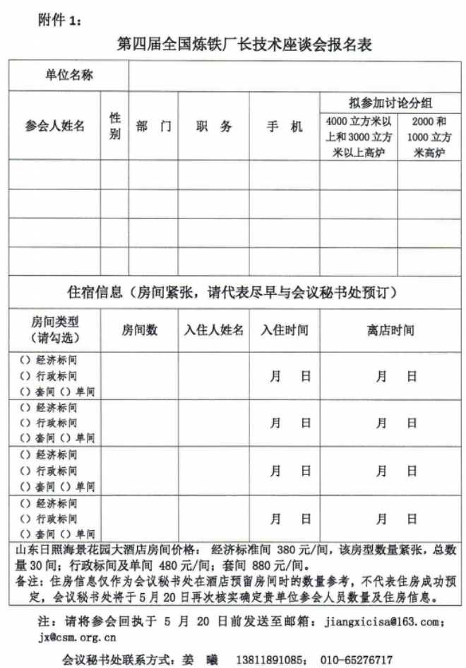 附件1. 第四屆全國煉鐵廠長技術座談會報名表