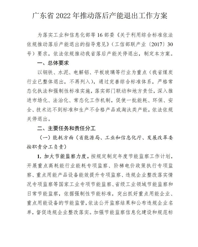 近日,廣東省工信廳網站發布了廣東省淘汰落後產能工作協調小組關於印發廣東省2022年推動落後產能退出工作方案的通知。《廣東省2022年推動落後產能退出工作方案》(以下簡稱《方案》)提出,以鋼鐵、水泥、電解鋁、平板玻璃等行業為重點,通過完善綜合標準體係,嚴格常態化執法和強製性標準實施,落實部門聯動和地方責任,深入推進市場化、法治化、常態化工作機製,促使一批能耗、環保、安全、技術達不到標準和生產不合格產品或淘汰類產能,依法依規關停退出。