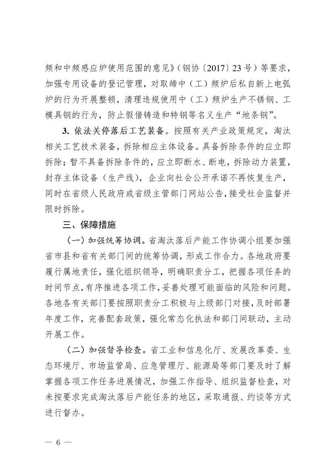 《方案》強調,嚴防“地條鋼”死灰複燃。加強專用設備的登記管理,對取締中(工)頻爐後私自新上電弧爐的行為開展整頓,清理違規使用中(工)頻爐生產不鏽鋼、工模具鋼的行為,防止假借鑄造和特鋼等名義生產“地條鋼”。