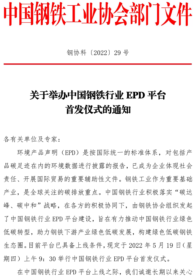 中國鋼鐵行業EPD平台首發儀式即將開播