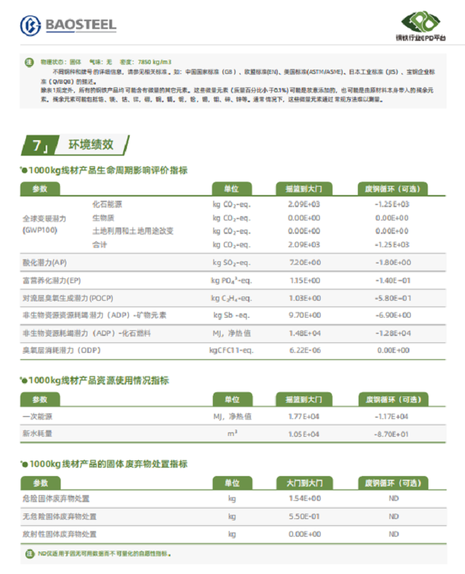 圖為寶鋼股份線材產品EPD中的環境績效頁截圖。