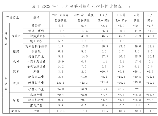 前5個月主要用鋼行業運行總體呈下行趨勢,5月鋼鐵需求環比回升