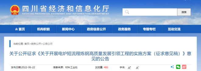 四川省具有電爐短流程煉鋼產業基礎好、水電等清潔能源豐富、廢鋼資源充足等優勢,為了先行先試開展示範,完善政策舉措,優化產業生態,加快推動電爐短流程煉鋼轉型升級,四川省特製定《關於開展電爐短流程煉鋼高質量發展引領工程的實施方案》。近日,四川省經信廳網站發布了關於公開征求《關於開展電爐短流程煉鋼高質量發展引領工程的實施方案(征求意見稿)》(以下簡稱《方案》)意見的公告。
