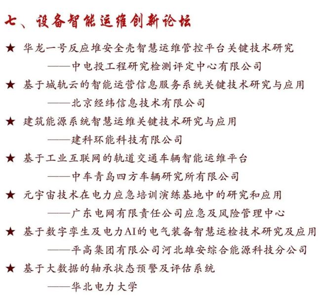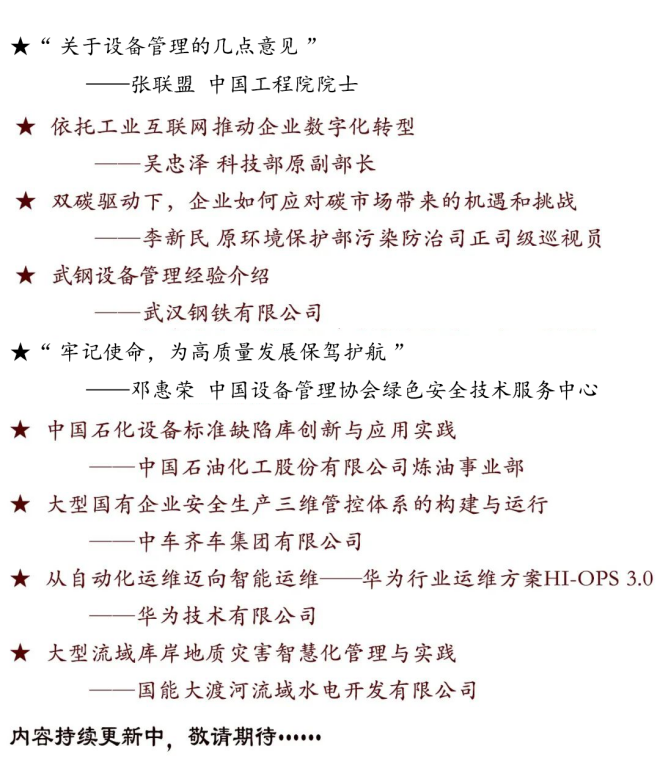 會議主題:創新引領高質量發展,助力構建新發展格局。會議包含國家及地方有關部門領導講話、院士專家主旨演講、發布第五屆全國設備管理與技術創新成果,展示交流創新成果;獲得本屆創新成果項目單位作大會經驗交流;舉辦電力、石油化工、煤炭、鋼鐵行業以及設備全壽命、設備智能運維及數字經濟等專業論壇。