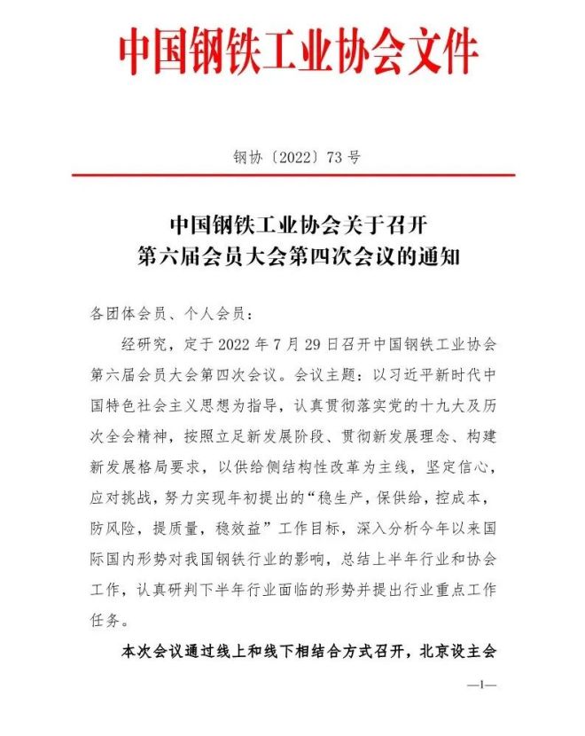 中國鋼鐵工業協會關於召開第六屆會員大會第四次會議的通知
