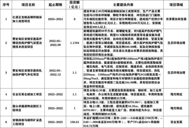 此外,從《通知》中獲悉,首都經濟圈重要支點建設“十四五”重點項目清單也予以公布,其中涉及到京津冀協同發展、新型城鎮化、社會治理、安全發展、文旅體育、基礎設施、民生、現代物流、生態環境治理等9個項目領域的130個重點項目。其中涉及到鋼鐵行業相關的6個,詳情如下: