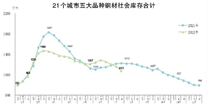 7月下旬,21個城市五大品種鋼材社會庫存為1073萬噸,環比減少85萬噸,下降7.3%,庫存降幅擴大;比6月下旬減少179萬噸,下降14.3%;比今年初增加285萬噸,上升36.2%;比去年同期減少149萬噸,下降12.2%。