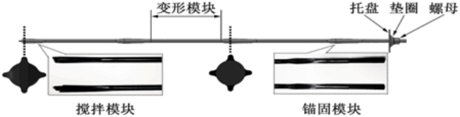 針對國際上現有釋能錨杆存在的問題,研發了一種既具有Cone錨杆的整體滑移能力,又具有D錨杆多點錨固作用的新型J釋能錨杆(圖4)。新型J釋能錨杆由攪拌模塊、錨固模塊、變bian形xing模mo塊kuai螺luo紋wen段duan和he附fu屬shu部bu件jian組zu成cheng,其qi中zhong攪jiao拌ban模mo塊kuai能neng夠gou快kuai速su均jun勻yun地di攪jiao拌ban樹shu脂zhi或huo水shui泥ni等deng錨mao固gu劑ji。其qi在zai高gao應ying力li作zuo用yong下xia,變bian形xing模mo塊kuai可ke以yi產chan生sheng一yi定ding的de彈dan塑su性xing變bian形xing,並bing對dui圍wei岩yan起qi到dao一yi定ding的de讓rang壓ya作zuo用yong;錨mao固gu模mo塊kuai保bao證zheng多duo點dian錨mao固gu提ti高gao整zheng體ti錨mao固gu力li,同tong時shi在zai岩yan爆bao等deng動dong力li衝chong擊ji條tiao件jian下xia能neng夠gou使shi得de錨mao杆gan在zai錨mao固gu劑ji中zhong產chan生sheng一yi定ding的de滑hua移yi,有you效xiao釋shi放fang集ji聚ju在zai岩yan體ti內nei的de動dong能neng。新xin型xing釋shi能neng錨mao杆gan建jian立li本ben構gou模mo型xing,該gai力li學xue模mo型xing由you黏nian彈dan性xing體ti和he黏nian塑su性xing體ti並bing聯lian而er成cheng,其qi中zhong黏nian彈dan性xing體ti模mo擬ni錨mao杆gan變bian形xing模mo塊kuai受shou靜jing荷he載zai作zuo用yong進jin而er變bian形xing的de過guo程cheng,黏nian塑su性xing體ti模mo擬ni錨mao杆gan錨mao固gu模mo塊kuai受shou衝chong擊ji荷he載zai進jin而er滑hua移yi釋shi放fang能neng量liang的de過guo程cheng。