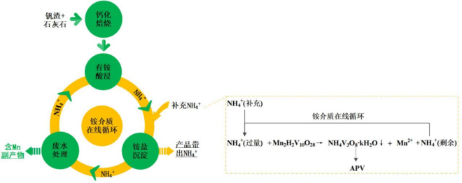 項目分析發現,傳統提釩工藝中鈉鹽等堿金屬化合物易溶於水,在水係統“易進難出”,無法有效排出是廢水難處理和固廢多的根源;進一步推廣到堿金屬鹽類,也存在類似問題;其次,由於堿金屬鹽活性強,高溫焙燒副反應多,導致用量大,以致最終固廢種類多、量大且難處理。製取高質量釩產品需要使用銨鹽作為沉澱劑,但同時也帶來了高氨氮廢水處理成本極為高昂和無法回用的難題。