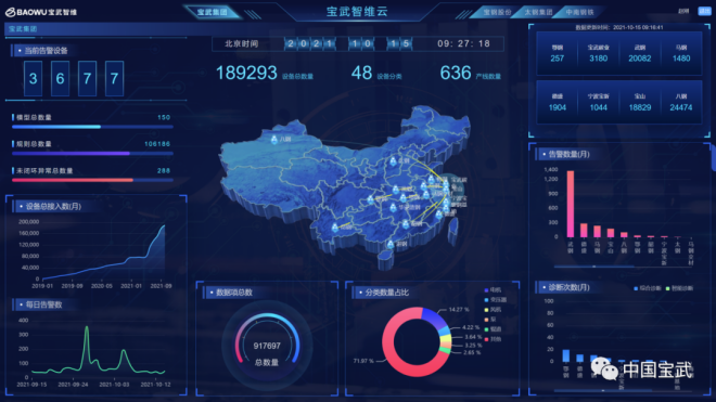 “鋼鐵行業設備智能運維係統解決方案研究及應用”項目由寶武智維聯合寶鋼股份、中南鋼鐵、北科大等單位共同完成。項目針對鋼鐵行業智能製造發展的設備運維關鍵問題,在智能運維平台、專家係統、運維標準及運維體係四個方麵形成十餘項創新成果,形成覆蓋鋼鐵生產全流程的設備智能運維係統解決方案。現已覆蓋21家大型鋼鐵企業900多條產線,有效實現了設備智能運維,達到國際領先水平。