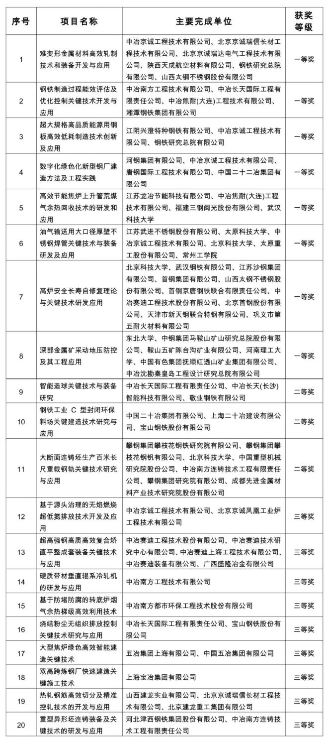 8月2日,中國鋼鐵工業協會發布公告顯示,按照《中國鋼鐵工業協會、中國金屬學會冶金科學技術獎獎勵條例》及其《實施細則》規定,經嚴格評審,冶金科學技術獎獎勵委員會決定對111個項目授予2022年中國鋼鐵工業協會、中國金屬學會冶金科學技術獎,其中,特等獎1項、一等獎23項、二等獎29項、三等獎58項。