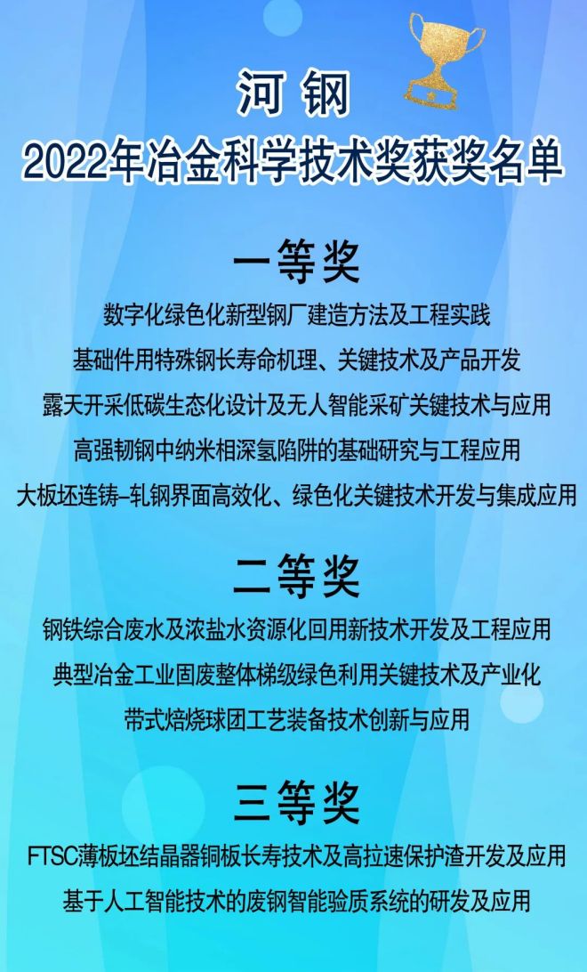 近日,2022年冶金科學技術獎揭曉,河鋼10個項目獲獎。其中,一等獎5項,二等獎3項,三等獎2項。