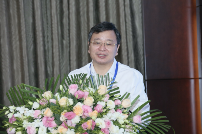圖為楊憲禮作《政產學研協同創新,實現新鋼鐵低碳數字化發展》報告