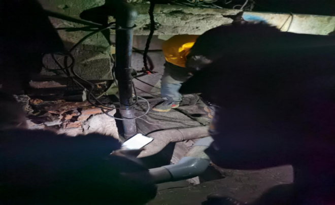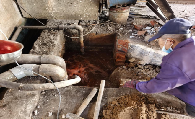 現場檢查時,該公司甘寶素生產車間正在調試,有4名工人正在對汙水收集池進行防腐作業。汙水處理車間內有2名工人正在安裝汙水處理設備,新安裝的氨氮吹脫塔與兩個汙水收集罐(舊反應釜)相xiang連lian接jie,罐guan內nei裝zhuang有you甘gan寶bao素su工gong序xu產chan生sheng的de生sheng產chan廢fei水shui。兩liang個ge汙wu水shui收shou集ji罐guan下xia方fang的de控kong製zhi閥fa門men均jun連lian接jie有you排pai水shui軟ruan管guan,兩liang根gen排pai水shui軟ruan管guan伸shen向xiang地di麵mian上shang一yi個ge直zhi徑jing約yue25厘米的孔洞,孔洞內有鐵製管道通向地下井。經現場測量,孔洞下的管道深約10米,周邊地麵上有明顯的排水痕跡。經對汙水收集罐和地下井內的存水進行同源性監測,確認地下井內有生產廢水。