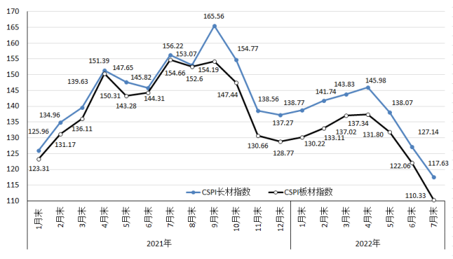 7月末,CSPI長材指數為117.63點,環比下降9.51點,降幅為7.48%;CSPI板材指數為110.33點,環比下降11.73點,降幅為9.61%,高於長材2.13個百分點;與上年同期相比,長材、板材指數分別下降38.59點和44.33點,降幅分別為24.70%和28.66%。(見下圖、表)