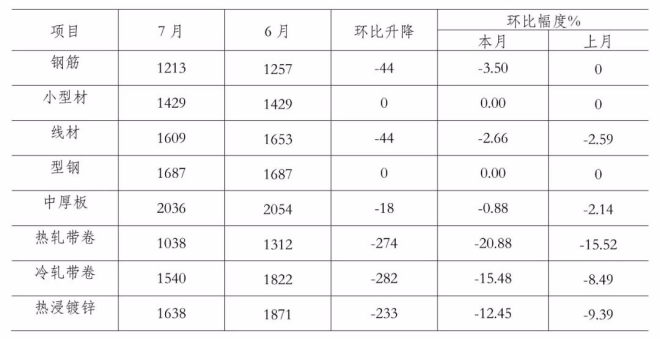 由於國內市場鋼材需求增長不及預期,疊加鐵礦石、煤焦等原燃料價格回落,對鋼價的支撐作用也有所減弱,7月份鋼材價格繼續呈下行走勢。