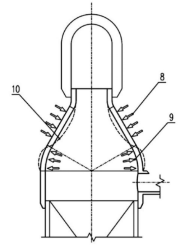 圖2為實踐中錐形砌體內襯高溫受力導致錐形砌體中部往下凸起變形、下部拱腳部位變形外擴導致耐材砌體受力和球麵部位爐殼受力狀態示意圖
