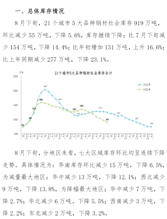 8月下旬鋼材社會庫存919萬噸,環比下降5.6%