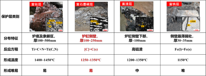 研發了兼具炭磚高導熱與陶瓷材料高耐蝕、且利於石墨碳沉積的碳複合耐火材料;同時開發了解決爐缸氣隙難題的石墨牆結構及氣隙治理優化技術,為石墨碳的析出奠定基礎。