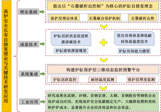 baozhanggaoluanquanchangshouyelianzhuyaocunzaisidajishunandian,jichuantonghulufangfaxiaoguobulixiang,lugangchangshoujichulilunboruo,lugangchangshouweihucuoshijingyanhuayijilugangbaohucengjiankongshouduanqueshi。jiyuyishangnanti,jin20年來,項目組基於20餘座高爐破損調查及高爐解剖研究,建立了爐缸保護層理論體係,揭示了爐缸耐火材料熱麵石墨碳析出的自保護機製,通過“石墨碳析出勢”對dui爐lu缸gang石shi墨mo碳tan護hu爐lu進jin行xing定ding量liang化hua診zhen斷duan,並bing從cong調tiao控kong爐lu缸gang活huo躍yue狀zhuang態tai以yi促cu進jin鐵tie水shui滲shen碳tan,和he優you化hua爐lu缸gang傳chuan熱re體ti係xi以yi降jiang低di耐nai火huo材cai料liao熱re麵mian溫wen度du兩liang個ge方fang麵mian實shi現xian高gao爐lu爐lu缸gang的de自zi修xiu複fu,並bing建jian立li了le高gao爐lu爐lu缸gang保bao護hu層ceng三san維wei可ke視shi化hua監jian控kong預yu警jing平ping台tai,其qi技ji術shu路lu線xian如ru圖tu2所示。