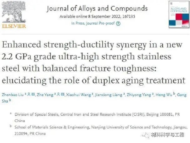 近日,鋼鐵研究總院特殊鋼研究院劉振寶教授團隊及南京理工大學沙剛教授團隊通過合金設計及熱處理工藝調控研發了一種新型2.2GPa級超高強度不鏽鋼,其室溫力學性能指標為:屈服強度1876MPa、抗拉強度2259MPa、斷後伸長率11.5%、斷麵收縮率52%以及平麵斷裂韌性43 MPa·m0.5。並基於多尺度、多層級表征結果,針對該合金體係鋼種,提出了一種簡單有效的優化其強-塑性匹配的熱處理工藝,即雙重時效處理工藝。