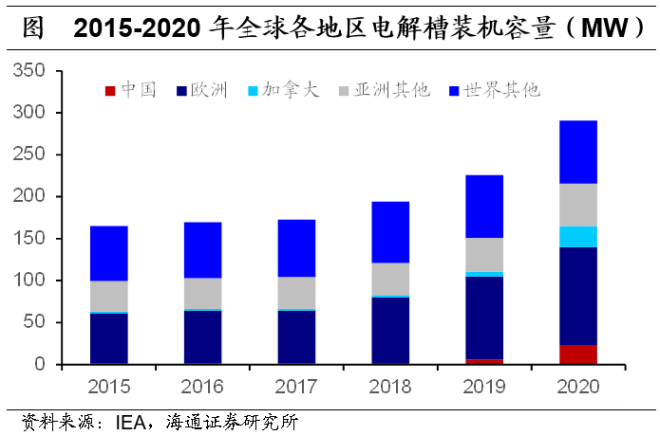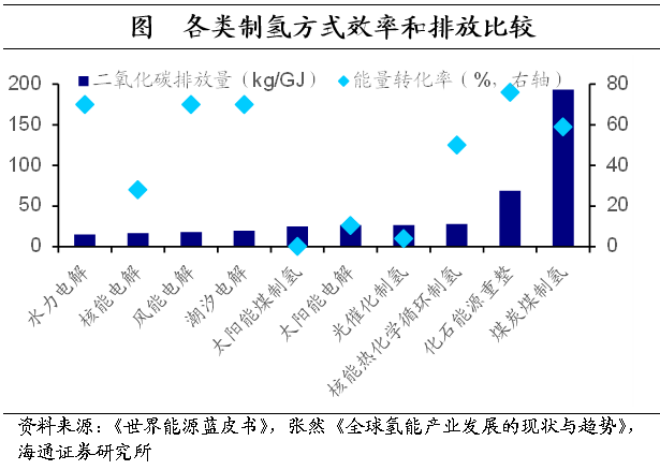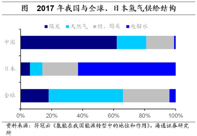 中國當前煤化工行業發展較為成熟,2016年我國煤製氫占比高達62%,相比來看,全球水平氫氣供給中僅有18%為煤製氫,而在氫能產業最為發達的日本,其煤製氫的比重僅為6%,電解水製取的綠氫占比高達63%。在zai以yi煤mei炭tan作zuo為wei製zhi氫qing主zhu要yao來lai源yuan的de情qing況kuang下xia,碳tan排pai放fang水shui平ping相xiang比bi直zhi接jie使shi用yong煤mei炭tan所suo差cha無wu幾ji,無wu法fa達da到dao低di碳tan的de要yao求qiu,所suo以yi當dang前qian我wo們men麵mian臨lin的de一yi個ge難nan點dian是shi需xu要yao加jia大da研yan發fa和he應ying用yong綠lv氫qing製zhi造zao技ji術shu的de比bi例li。