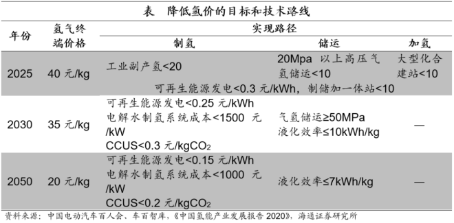 qici,zaidangqianjishutiaojianxia,woguoqingnengzhongduanxiaofeijiagegaoyuqitanengyuan,yaotuiguangqingnengdeshiyong,jiuyaoshixianlvqingpingjia。zhongguoqingnenglianmengzhuanjiaweiyuanhuizhurenyuzhuopingfenxi,ruguodao2025年我國風電、光伏的新增裝機發電成本降低到0.3元/千瓦時,綠氫成本將降到約25元/千克,能夠與天然氣製氫進行競爭。等2030年可再生能源發電成本降低到0.2元/千瓦時後,綠氫成本將低至15元/千克,可以與現在化石能源加上碳捕集技術製氫的價格進行競爭。《中國氫能產業發展報告2020》則給出了到2025、2030和2050年降低氫價至40、35、20元/千克的實現路徑表,可以看出,要使得氫能終端價格有所降低,需要依靠上遊製氫、儲運、加氫多環節的整合。