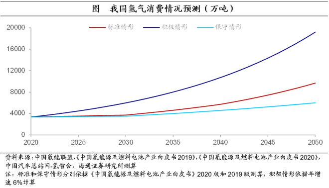 首先,從總量來看,氫能需求預計將保持年均3.5%左右的增速,成為我國能源體係的重要組成部分。根據行業權威機構中國氫能聯盟預計,到2030年碳達峰情景下,氫能在中國終端能源體係的占比將從2019年的2.7%提高到6%,而到2060年碳中和情景下,這一比重將提高到20%。這對應著我國對氫氣的年需求量,從2020年的3342萬噸,增長至2030年和2060年的3715萬噸和1.3億噸,年均增速約為3.5%。這一目標相較於該機構2019年製定的,未考慮“雙碳”目標下,年均增速2.0%的方案更為積極。