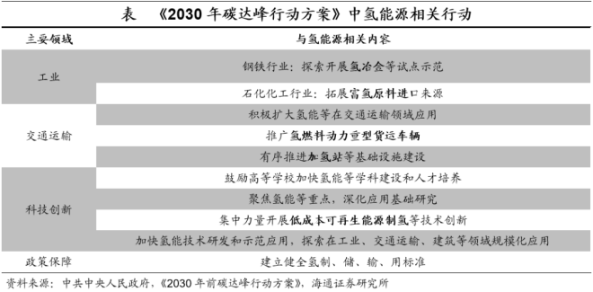 weileshixianzaigonggeiduanpingjiahexuqiuduanguangfanyingyongdemubiao,dangqiannaxieqingnengyuanchanyelingyuhesaidaogengzhideguanzhu?shouxian,womenkeyicankaozhengfubaogaozhongtidaodezhongdianjishulingyu,《2030年碳達峰行動方案》中提到了多項與氫能源相關的行動,如氫冶金試點、推廣氫燃料動力車輛、推進加氫站建設、創新低成本可再生能源製氫技術等。而在工信部發布的《“十四五”工業綠色發展規劃》中,也提到了發展可再生能源電解製氫技術,氫燃料燃氣輪機、超高壓氫氣壓縮機、高效氫燃料電池等新能源裝備,綠氫煉化等降碳技術等方向。