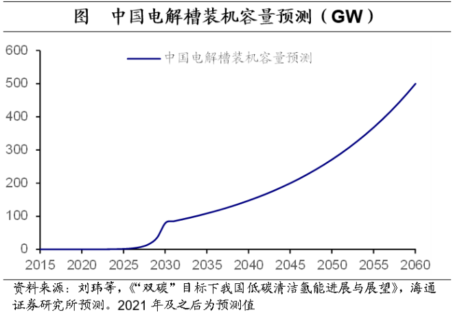 jutidi,womenanchanyeliandeshangzhongxiayoufenbiexunzhaoweilaidejiaodiansaidao。congshengchanduankan,hexinzaiyuruhedichengbenzhiqulingtanpaifangdelvqing,yucixiangguandesaidaobaokuodianjiecao、催化劑、碳捕集和封存(CCUS)等。其中,可以從低碳電力和水中產生幹淨的氫氣,是未來增加綠氫供給的核心。近年來我國電解製氫項目及裝機容量增速較快,從2015年的1.63MW,增至2020年的23.47MW,年均增速高達70.5%。要實現到2030年和2060年綠氫占比達13.5%和76.9%的目標,分別需要部署電解槽裝機80GW和500GW,這意味著在2020-2030年間要保持年均125.6%的超高增速,而在2030年後,年增速逐步趨於正常。