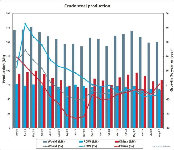 2022年8月全球粗鋼產量1.506億噸,同比下降3.0%
