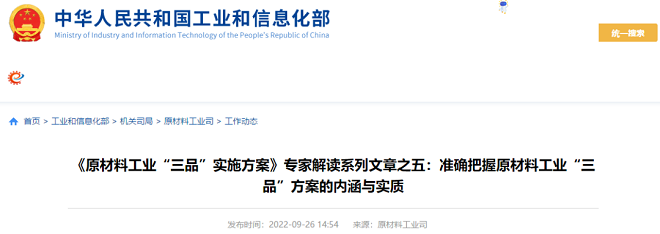 近日,中華人民共和國工業和信息化部網站發布了《原材料工業“三品”實施方案》專家解讀係列文章:準確把握原材料工業“三品”方案的內涵與實質。