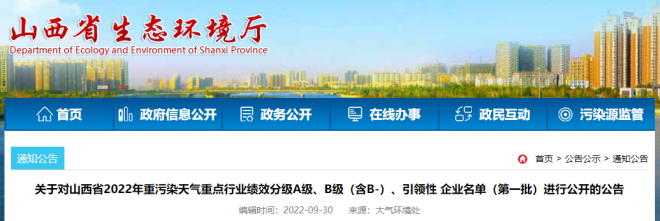 近日,山西省生態環境廳發布了《關於對山西省2022年重汙染天氣重點行業績效分級A級、B級(含B-)、引領性企業名單(第一批)進行公開的公告》(以下簡稱《公告》)。