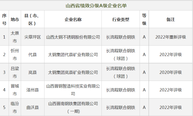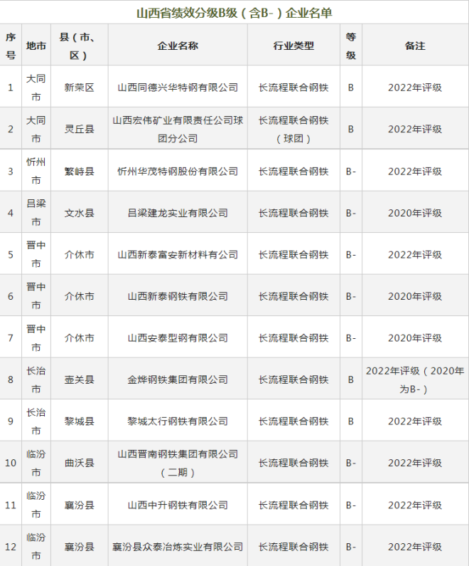 這些鋼企獲評山西2022年重汙染天氣重點行業績效分級A級、B級(含B-)