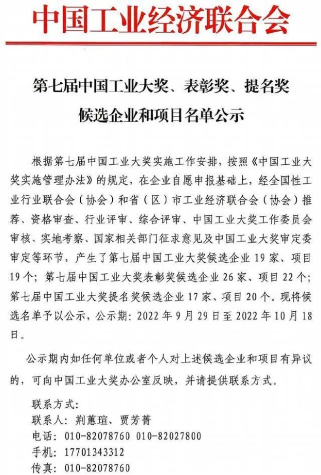 近日,第七屆中國工業大獎、表彰獎、提名獎候選企業和項目名單進行公示。根據第七屆中國工業大獎實施工作安排,按照《中國工業大獎實施管理辦法》的規定,在企業自願申報基礎上,經全國性工業行業聯合會(協會)和省(區)市工業經濟聯合會(協會)推薦、資格審查、行業評審、綜合評審、中國工業大獎工作委員會審核、實地考察、國家相關部門征求意見及中國工業大獎審定委審定等環節,產生了第七屆中國工業大獎候選企業19家、項目19個,第七屆中國工業大獎表彰獎候選企業26家、項目22個,第七屆中國工業大獎提名獎候選企業17家、項目20個。