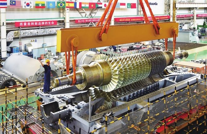 陝鼓成功研製全球最大、技術最先進的AV140軸流壓縮機,達到全球工業壓縮機領域全新高度。圖為機組吊裝現場。